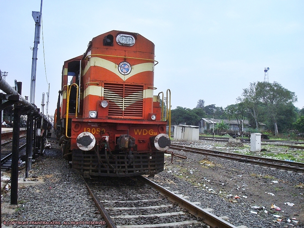 13050-WDG3A-GY --- A Gooty Alco freighter standing with fully loaded BCNA rakes waiting for signal clearance at Varanasi. Photographed by Somsubhra Das. D.O.P. - 21st October 2012.