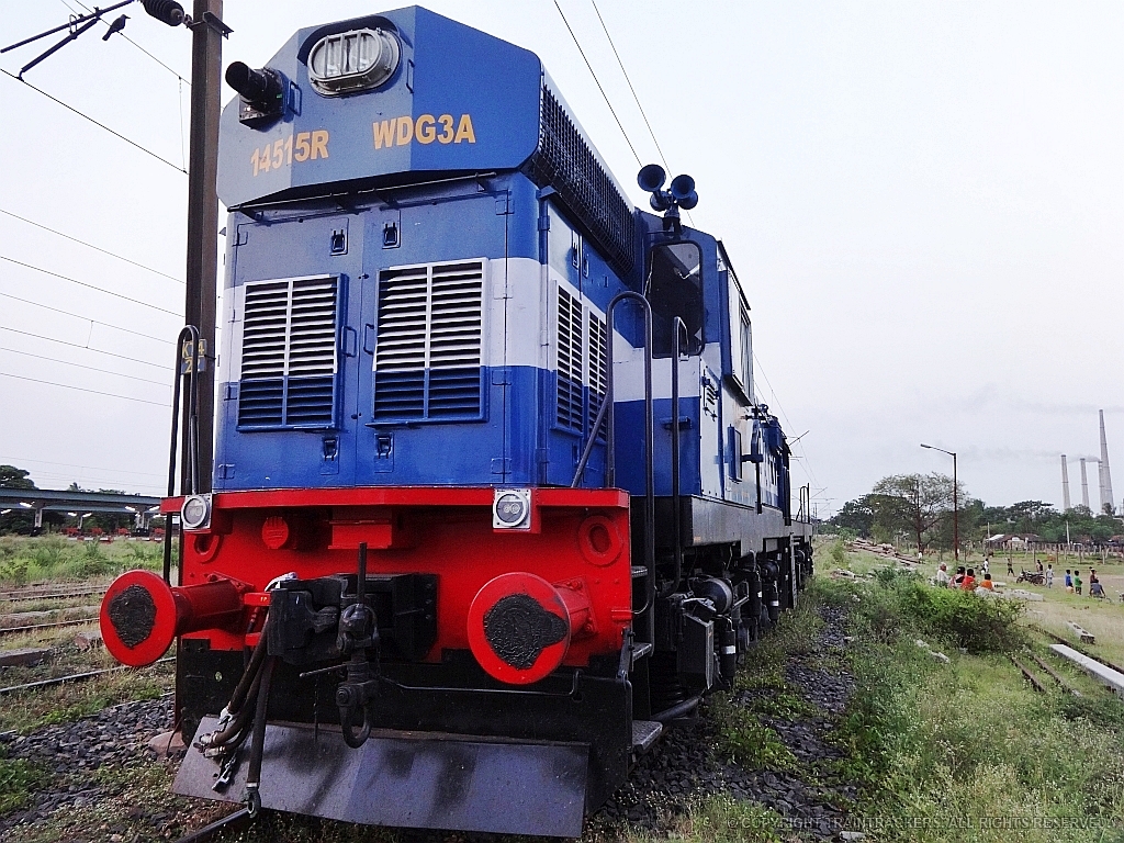 14515-WDG3A-VSKP --- The superstar from VSKP pays a visit to MCA for bringing in coal for the Kolaghat Thermal Power Station - the chimneys of which can be seen in the background. Photo taken by Somsubhra Das. D.O.P. - 8th June 2015.